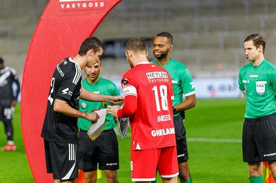 Half oktober 2023. Het was nauwelijks twee jaar geleden dat KAS Eupen voor het laatst op bezoek kwam in het Bosuilstadion. Sindsdien liepen de wegen van beide clubs in het nationale voetbal uiteen. Maar zie, eind oktober van een voor de oudste club van 't land desastreus verlopen maand, mochten de Oostkantonners zich opnieuw komen meten in het alweer vernieuwde Bosuilstadion. Dit keer in het kader van de nationale bekercompetitie. Blessures beperken de keuzemogelijkheden van Antwerpcoach Stef Wils. De geblesseerde Farouck Adekami werd net als zondag tijdens de topper tegen Club Brugge KV, vervangen door Marwan Alsahafi, nu vanaf het begin van de partij. Voor de overige was de startersrij een perfecte doorslag van de twaalfde speeldag van de Jupiler Pro League, kwalificatie voor de volgende ronde het enig juiste resultaat. Ondanks de zege afgelopen weekeinde tegen Young KRCG, roteerde bezoekend coach Nogueira op liefst zes plaatsen. De keuze centraal in defensie en in doel zal hij zich allicht beklaagd hebben. Beide aanvoerders (foto: De ANTWERPSUPPORTER Online) meldden zich voor die zestiende finale van de Croky Cup bij scheidsrechter Simonini, die voor het eerst een wedstrijd met inzet van de Great Old zou leiden. | |
