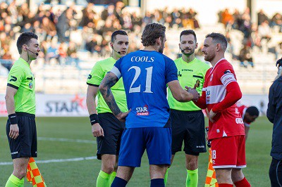 Met de 21e speeldag in het Dender Football Complex begon niet alleen de race van het nieuwe kalenderjaar, maar ook de onverbiddelijke strijd naar het einde van de reguliere competitie toe. Coach Joseph Oosting had na de ellenlange plaatsingswedstrijd van de kwartfinales van de Croky Cup zijn team in weinige dagen zijn team moeten voorbereiden op deze aartsmoeilijke opdracht. De rood-witte getrouwen wisten maar al te goed de bittere smaak te herinneren van de nederlaag in eigen huis tegen de reekslaatste FCV Dender EH. De technische staf wilde in tegenstelling tot de thuisploeg deze wedstrijd in ongewijzigde samenstelling afwerken. Hoewel aangekondigd tot minuten voor de opwarming, bleek Mauricio Benitez uiteindelijk niet wedstrijdfit. In zijn plaats deed de selectieheer beroep op Dennis Praet. Lokale coach Hayk Milkon wisselde niet alleen op zes plaatsen, maar ook van tactisch bord voor deze thuiswedstrijd. Ook voor FCV Dender EH breken beslissende weken aan om mogelijk nog van de laatste plaats in de reeksrangschikking weg te geraken. Aanvoerders Cools en Vincent Janssen (foto: De ANTWERPSUPPORTER Online) volbrachten de verplichtingen bij scheidsrechter Allaerts. | |